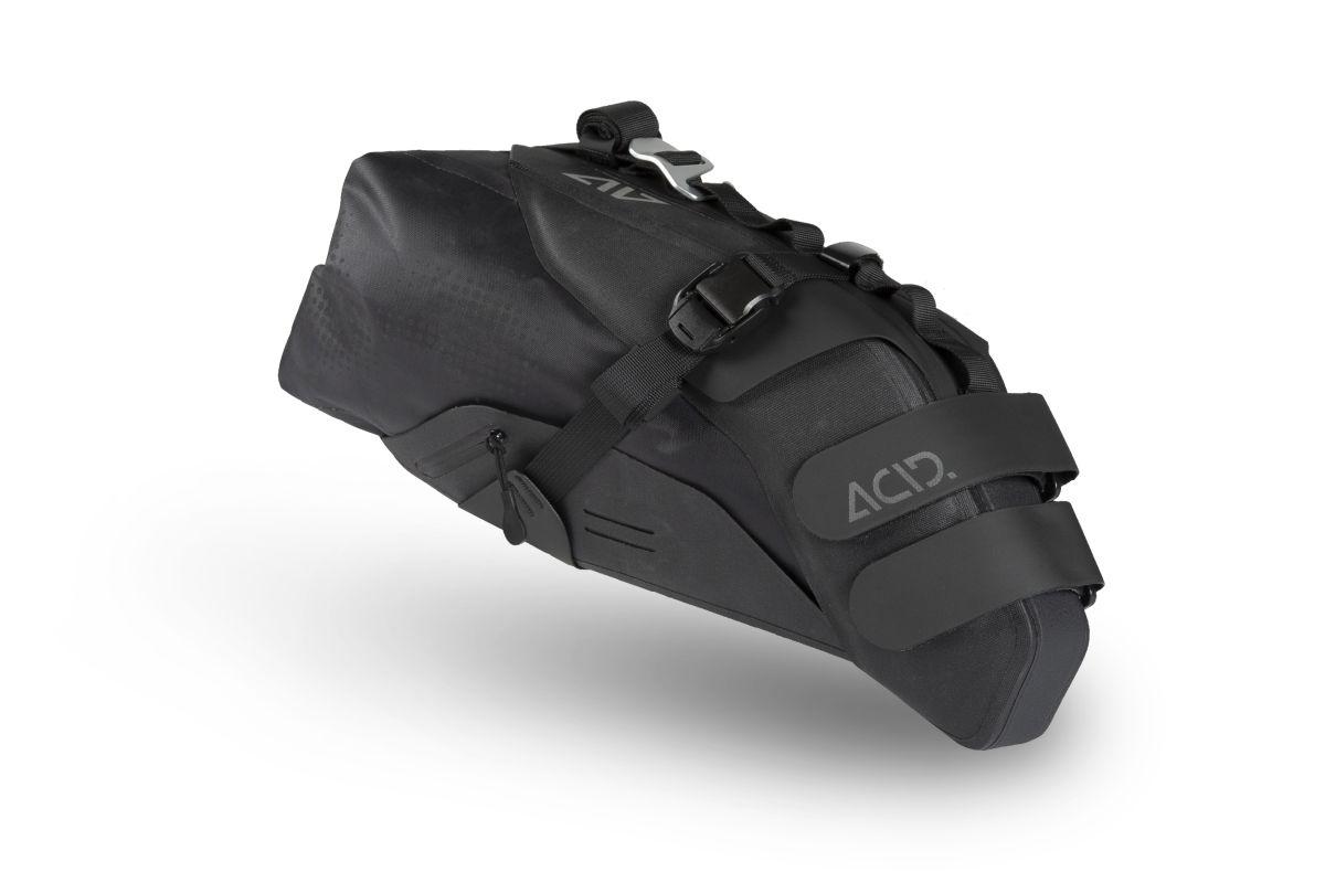 Vom Micro-Adventure bis zur längeren Bikepacking-Tour: Das ACID PACK PRO 11 wurde mit erfahrenen Bikepackern entwickelt. Das zweiteilige System aus Harness und wasserdichter, verschweißter Drybag ist funktionell konzipiert. Dank des flexiblen MOLLE-Systems lässt sich der Harness sicher an Rail und Sattelstütze anbringen und kann auch am Rad verbleiben. Die robuste Dry Bag wird in den Harness gesteckt, fixiert und ist abends oder zwischendurch schnell wieder entnommen. Ein weiteres Feature: Der Tascheninhalt lässt sich durch ein integriertes Entlüftungsventil noch weiter komprimieren. Reflektierende Elemente an beiden Teilen erhöhen die Sichtbarkeit im Straßenverkehr. Auch ein Rücklicht lässt sich problemlos integrieren.