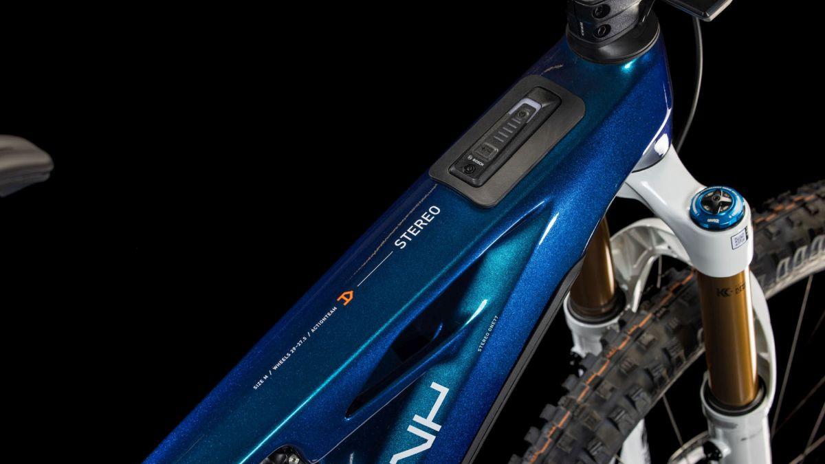 Der Rahmen des Stereo Hybrid ONE77 HPC ist wahrlich eine Klasse für sich, denn hier treffen 170 mm Federweg an der Front und am Heck auf ein Mullet-Set-up mit einem 29 Zoll Vorderrad und 27.5 Zoll Hinterrad. Damit werden Big-Mountain-Trail-Träume wahr! Wie immer bei CUBE maximal detailverliebt konstruiert auch der Rest: Integrated Cable Routing sorgt für einen supercleanen Look und reduziert den Wartungsaufwand auf ein Minimum. Dazu kommt ein Steuersatz zur Winkelverstellung, mit dem sich das Handling an individuelle Vorlieben und Anforderungen anpassen lässt. Außerdem haben wir den 800 Wh starken PowerTube Akku gleich über dem Bosch CX Motor sauber und formschön ins Carbon-Unterrohr integriert. Für einfachere Ersatzteilverfügbarkeit gibt's ein UDH am Aluminium-Hinterbau – und weil wir auch eine Direct Mount Kettenführung verbaut haben, geht's mit diesem Fully selbst bei schwierigen Bedingungen weiter, weiter und immer weiter.