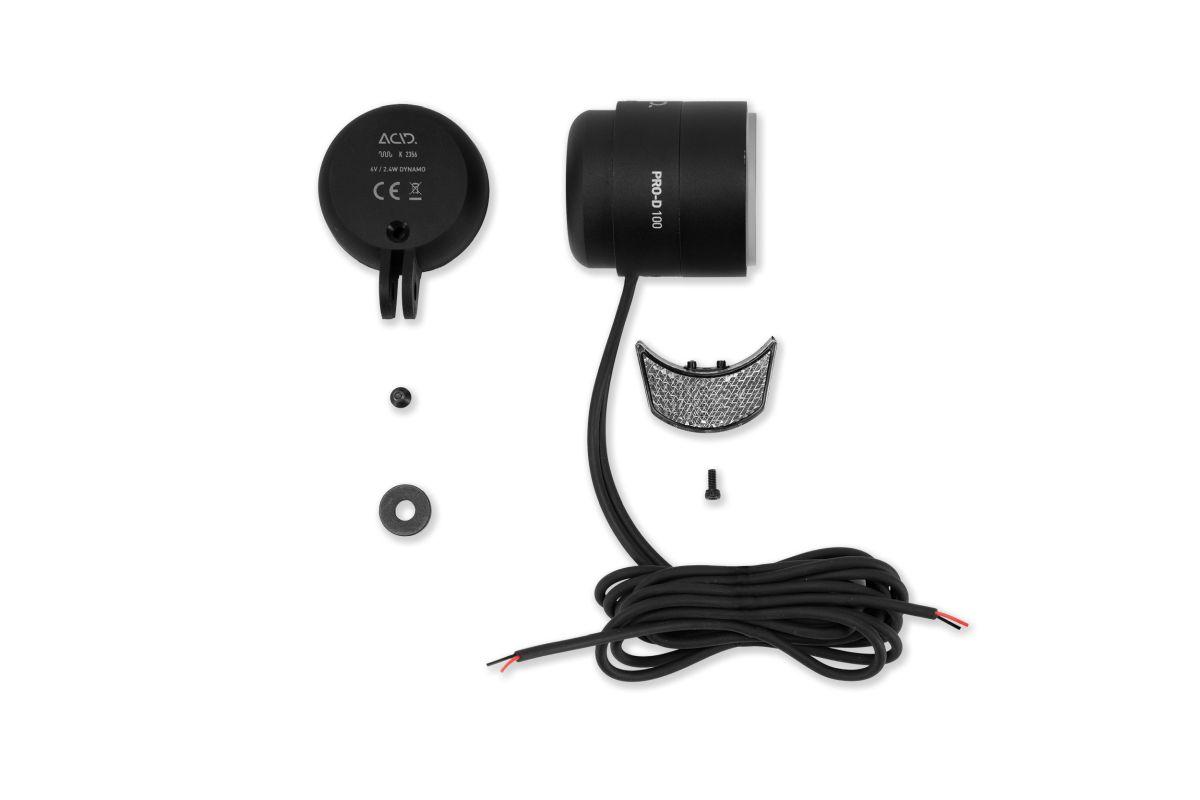 Dynamo LED-Frontlicht, StVZO zugelassen, 100 Lux, inkl. K-Reflektor, GoPro-kompatiblem Universaladapter und Gabelhalter, Inkl. ACID Gabelhalterung Universal HPP, Schutzklasse IPX6, Lichtsensor, 15 Lux Automatische Day-Mode-Function, Standlicht, 98 cm Lichtkabel zu Dynamo, 108 cm Lichtkabel zu Rücklicht