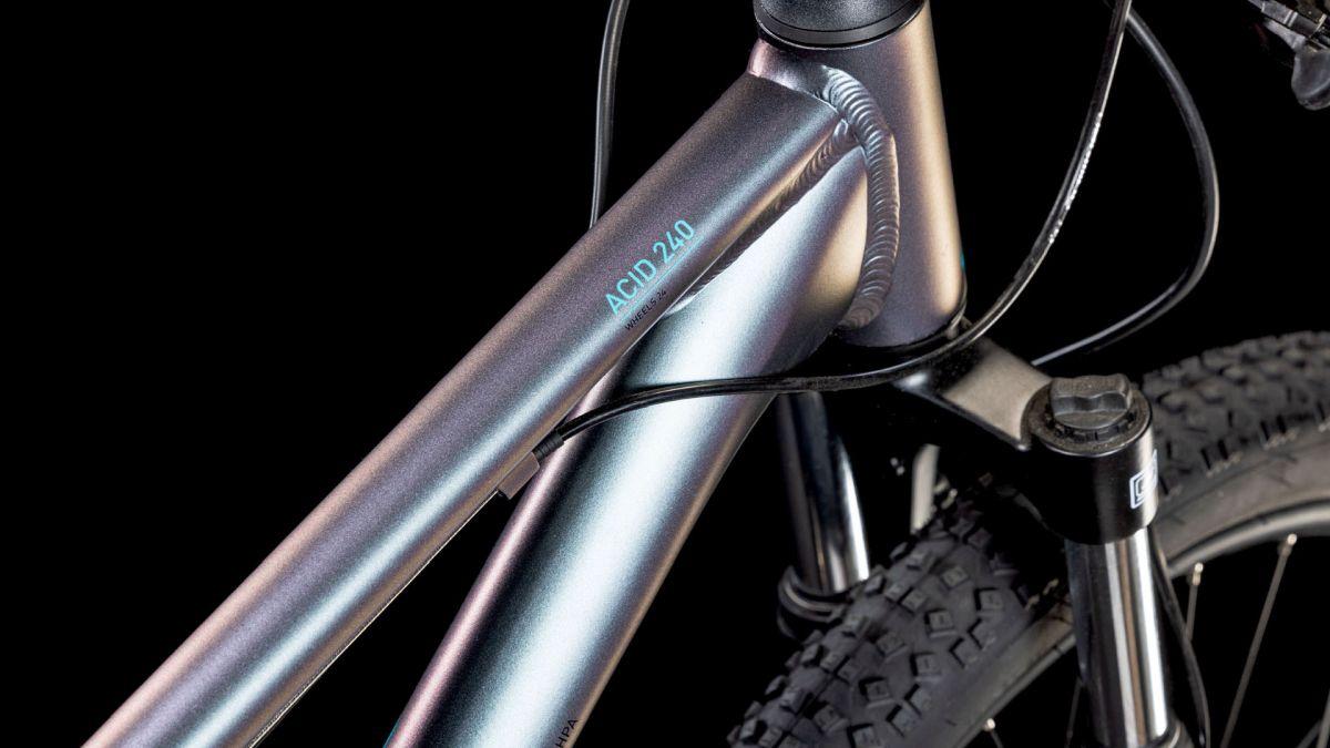 Der Rahmen des Acid 240 Disc besteht aus denselben hitzebehandelten 6061er-Aluminiumrohrsätzen wie der unserer Erwachsenen-Mountainbikes und ist demnach genauso robust und stabil. Allerdings haben wir seine Proportionen und das Gewicht auf die Anforderungen von Kindern abgestimmt. Die montierten Scheibenbremsen sind leicht bedienbar und unterstützen kraftvolle, sichere Bremsmanöver bei jedem Wetter. Zudem können Schutzbleche verschraubt werden – und ein Flaschenhalter, damit die Youngsters unterwegs immer top versorgt sind. Sein Handling verspricht hohen Fahrspaß und zugleich Zuverlässigkeit – so kann der Nachwuchs jede Menge Selbstvertrauen tanken. Weil sich der eine oder andere Sturz kaum vermeiden lässt, haben wir zudem ein einfach austauschbares Schaltauge verbaut. Dadurch gehören aufwendige Reparaturen nach einem Aufprall der Vergangenheit an.
