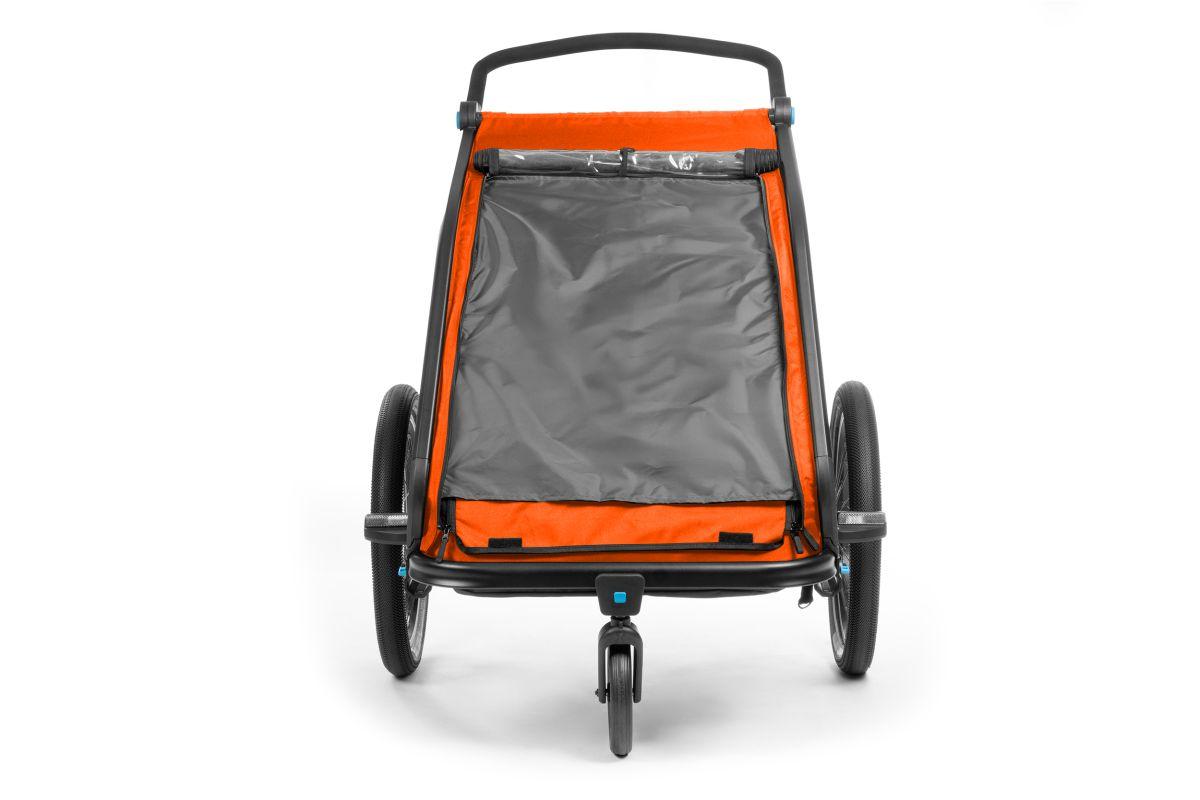 einfache Handhabung, Sitz- und Rückenpolster, verstellbare Kopfpolster mit Helmpocket, Heckfenster, Sonnen-, Fliegen- und Spritzwasserschutz, höhenverstellbarer, ergonomischer Griff, seitliche Belüftung, 70 Liter Kofferaum, verstellbare Federung, Quick-Release Räder, farblich abgesetzte Funktionsteile, reflektierende Elemente, inkl. Deichsel, Fahne, Buggyrad, Rücklicht mit Batterien, Max. Zuladung 42 kg, Stützlast: 1 - 8 kg