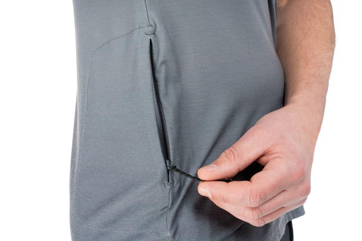 atmungsaktives, schnelltrocknendes Funktionsmaterial mit Baumwollhaptik, Tasche mit Reißverschluss hinten, dezenter Druck, Model ist 185 cm groß, Model trägt Größe M