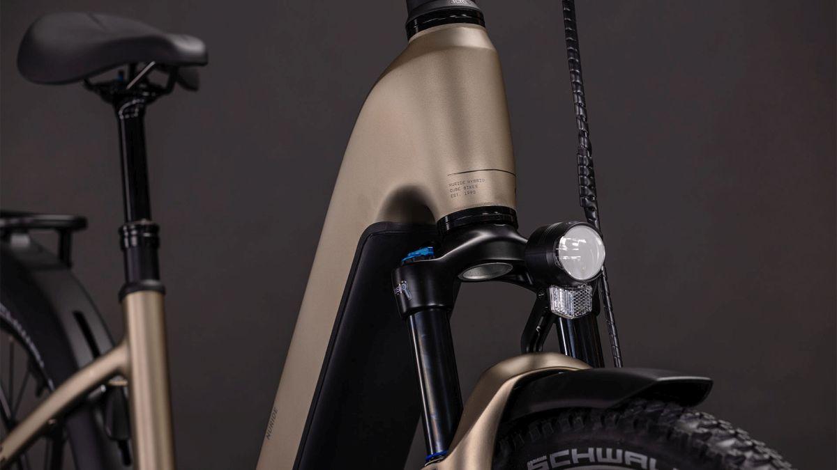 Der Tiefeinsteiger-Rahmen des Nuride Hybrid hält, was sein Name verspricht – einfaches, unkompliziertes Auf- und Absteigen sind damit fix inklusive. Doch da ist noch mehr: Neben einer Federgabel mit 100 mm Federweg für ein Plus an Fahrkomfort und Kontrolle haben wir das Chassis mit großzügiger Reifenfreiheit (sogar inklusive der mitgelieferten Schutzbleche) ausgestattet. Im Inneren verlaufende Züge unterstreichen die cleane Optik. Ebenso harmonisch ins Rahmendesign integriert sind der Bosch CX Antrieb und der 800 Wh PowerTube Akku. On top gibt's einen integrierten Kettenschutz, serienmäßig verbaute Schutzbleche, Lichter, einen Seitenständer und unseren stabilen semi-integrierten Gepäckträger 2.0. Da kann das nächste Zweiradabenteuer direkt losgehen, oder?