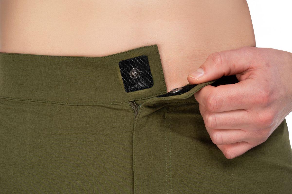 leichtes, robustes Material, zwei Taschen mit Reißverschluss, Bund mit elastischem Einsatz, Model ist 185 cm groß, Model trägt Größe M
