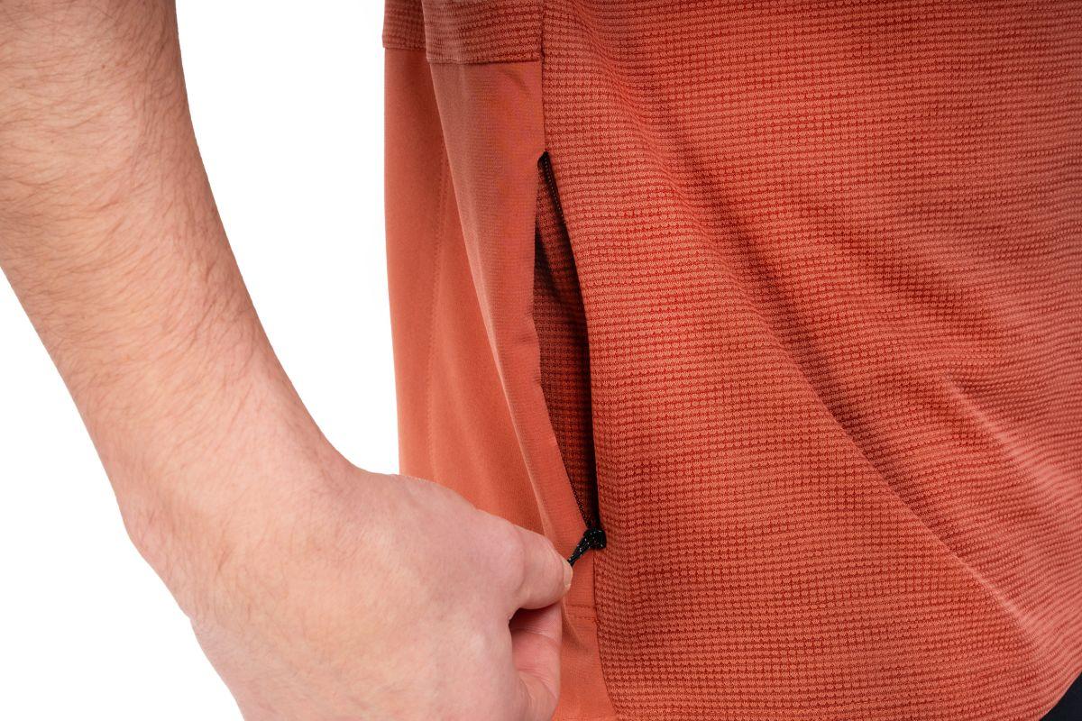 partieller Frontreißverschluss für bessere Belüftung, atmungsaktives Strickmaterial, Tasche mit Reißverschluss hinten, abriebfestes Material an Schulter und hinterem Saum, Model ist 185 cm groß, Model trägt Größe M